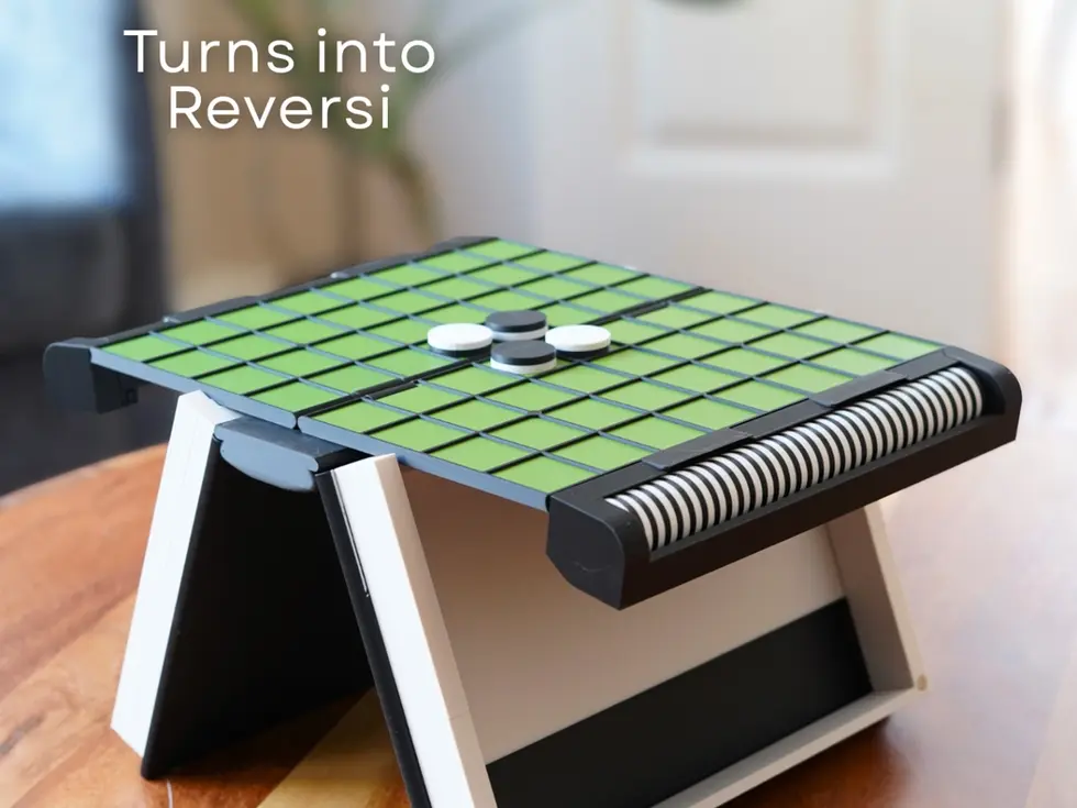 This design blends in on your bookshelf or table. But when you're ready to play, turn the cover and you're playing Reversi. The book folds open revealing a beautiful board. There are long slots to hold all of your Reversi Chips. The cover is magnetized on, and swivels open so you can slide out the pieces.